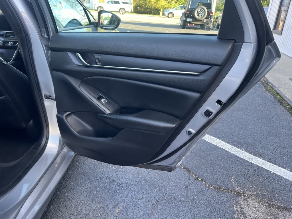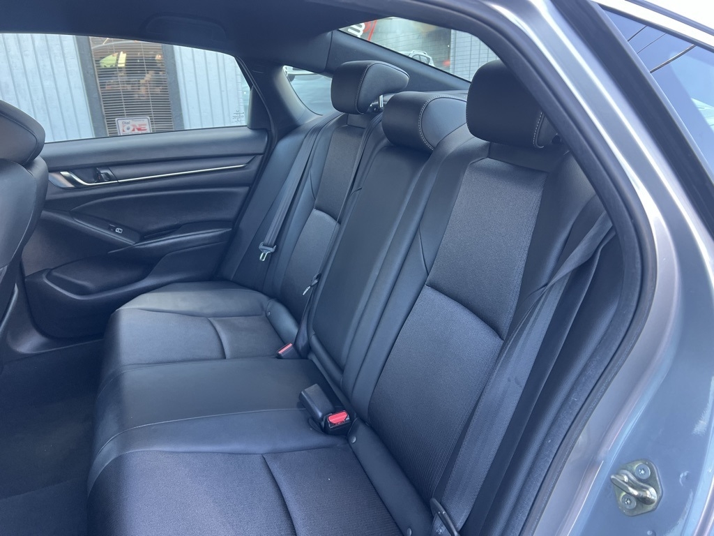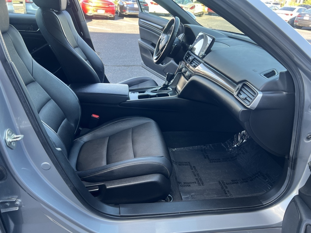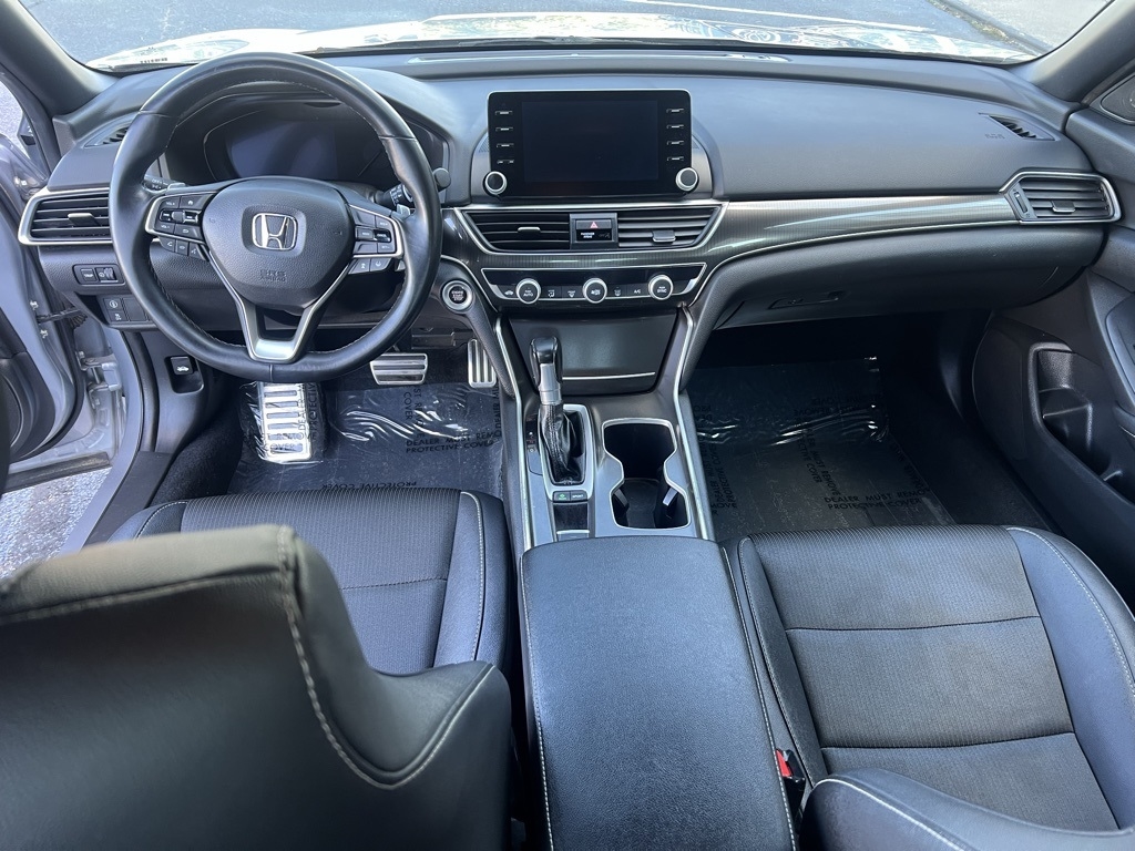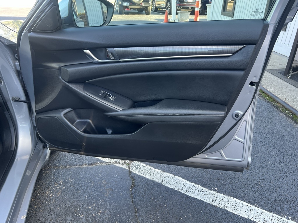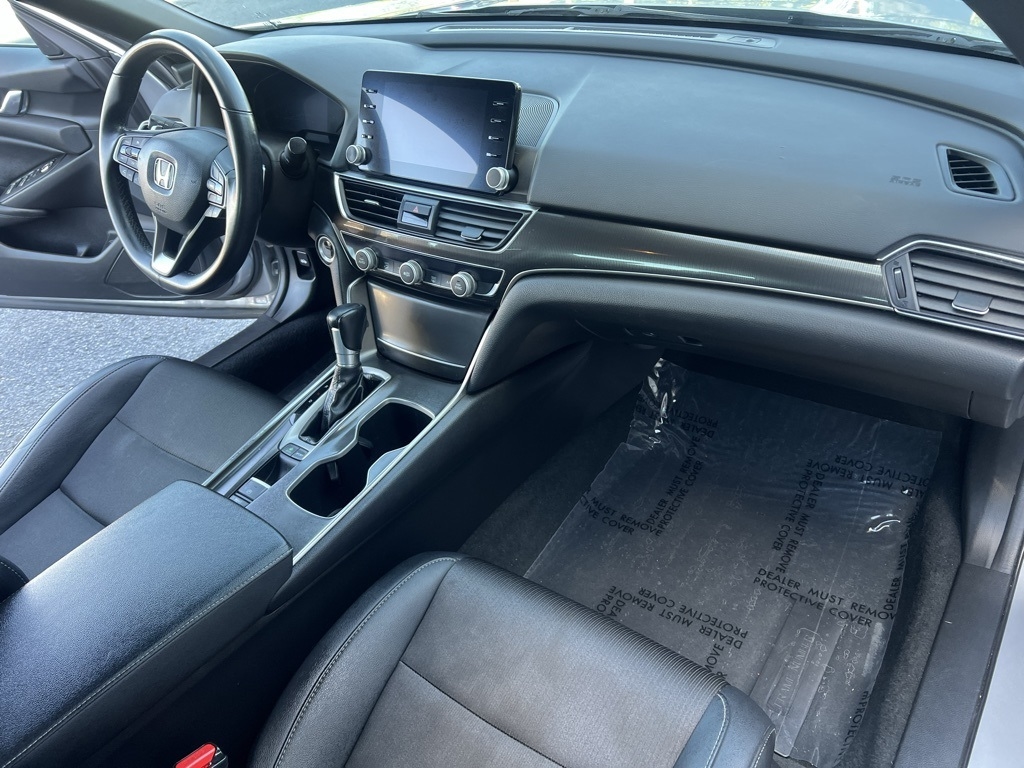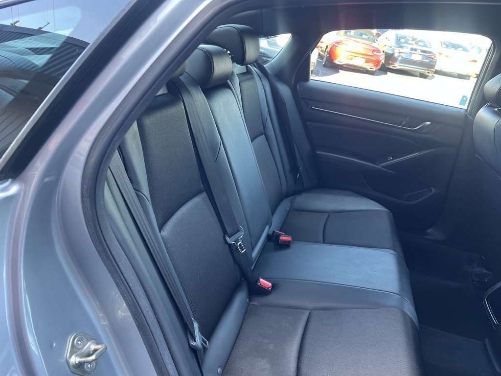 Accord Sport, 4D Sedan, 1.5T I4 DOHC 16V Turbocharged VTEC, CVT, FWD, Silver, Black Cloth, 4-Wheel Disc Brakes, 8 Speakers, ABS brakes, Air Conditioning, Alloy wheels, AM/FM radio, Apple CarPlay/Android Auto, Auto High-beam Headlights, Automatic temperature control, Brake assist, Bumpers: body-color, Cloth Seat Trim, Delay-off headlights, Driver door bin, Driver vanity mirror, Dual front impact airbags, Dual front side impact airbags, Electronic Stability Control, Emergency communication system: HondaLink, Exterior Parking Camera Rear, Forward collision: Collision Mitigation Braking System (CMBS) + FCW mitigation, Four wheel independent suspension, Front anti-roll bar, Front Bucket Seats, Front Center Armrest, Front dual zone A/C, Front fog lights, Front reading lights, Fully automatic headlights, Illuminated entry, Knee airbag, Leather Shift Knob, Leather steering wheel, Low tire pressure warning, Occupant sensing airbag, Outside temperature display, Overhead airbag, Overhead console, Panic alarm, Passenger door bin, Passenger vanity mirror, Power door mirrors, Power driver seat, Power steering, Power windows, Radio data system, Radio: 180-Watt AM/FM Audio System, Rear anti-roll bar, Rear seat center armrest, Rear window defroster, Remote keyless entry, Security system, Speed control, Speed-sensing steering, Speed-Sensitive Wipers, Split folding rear seat, Spoiler, Steering wheel mounted audio controls, Tachometer, Telescoping steering wheel, Tilt steering wheel, Traction control, Trip computer, Variably intermittent wipers, Wheels: 19" Machine-Finished Alloy w/Black Inserts, Accord Sport, 4D Sedan, 1.5T I4 DOHC 16V Turbocharged VTEC, CVT, FWD, Silver, Black Cloth.