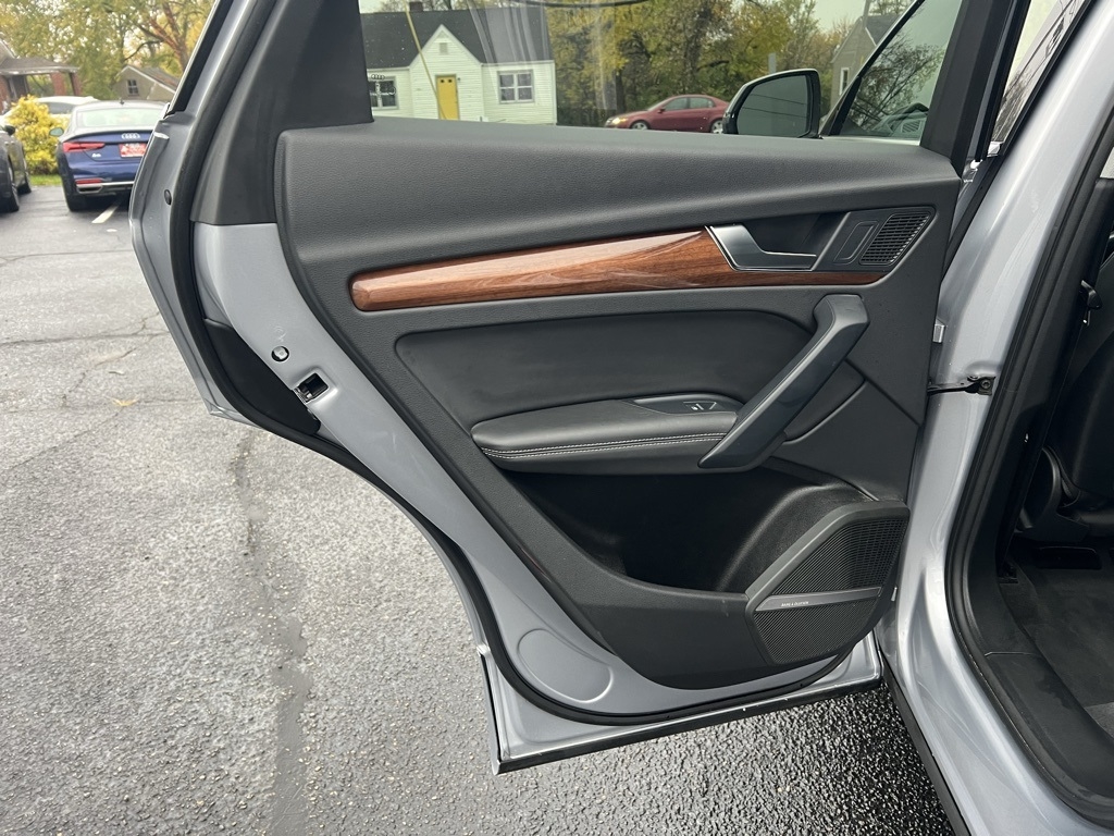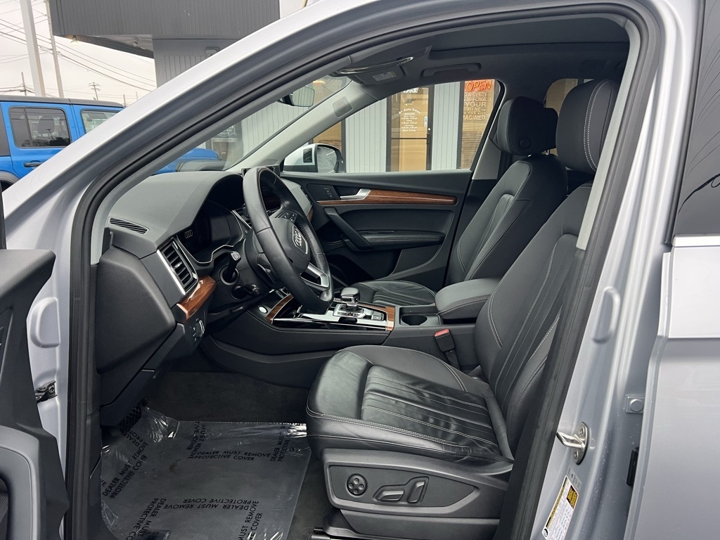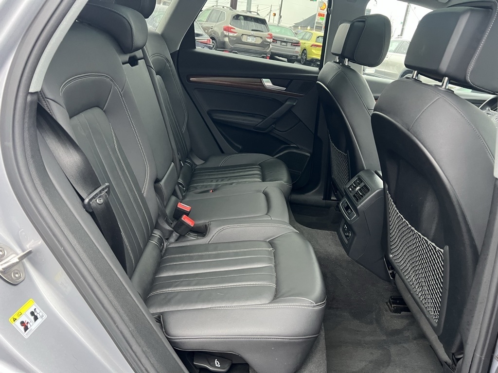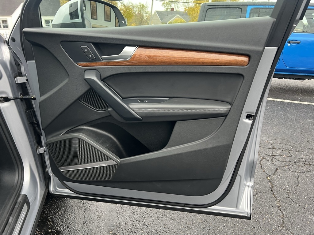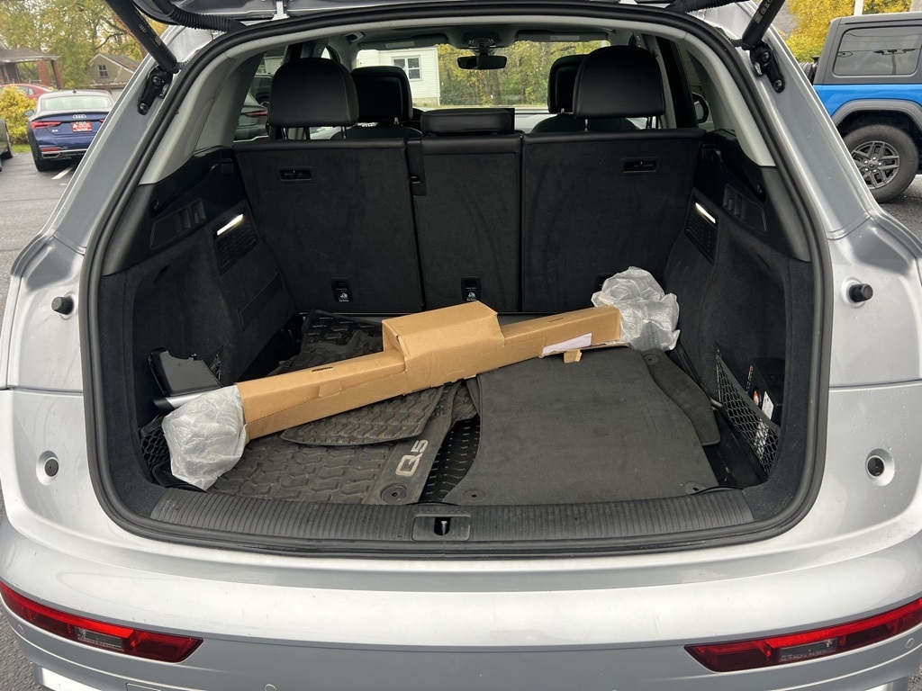 Q5 45 S line Premium quattro, 4D Sport Utility, 2.0L Turbocharged, 7-Speed Automatic S tronic, quattro, Silver Metallic, Black Leather, 10 Speakers, 4-Wheel Disc Brakes, 5.302 Axle Ratio, ABS brakes, Air Conditioning, All-Weather Floor Mats, Alloy wheels, AM/FM radio, Audi Active Lane Assist, Audi Advanced Key, Audi Guard Protection Kit, Audi Guard Wheel Lock Kit, Audi Virtual Cockpit Plus, Auto-Dimming Power Folding Exterior Mirrors, Auto-dimming Rear-View mirror, Automatic temperature control, Bang & Olufsen Sound System w/3D Sound, Brake assist, Bumpers: body-color, Cargo Mat, Compass, Convenience Package, Delay-off headlights, Driver door bin, Driver Seat Memory, Driver vanity mirror, Dual front impact airbags, Dual front side impact airbags, Electric Powered Steering Column Delete (DISC), Electronic Stability Control, Emergency communication system: Audi connect CARE, Exterior Parking Camera Rear, Four wheel independent suspension, Front anti-roll bar, Front Bucket Seats, Front Center Armrest, Front dual zone A/C, Front fog lights, Front reading lights, Garage door transmitter: HomeLink, Genuine wood console insert, Genuine wood dashboard insert, Genuine wood door panel insert, Hands-On Detection Steering Wheel, Heated 8-Way Power Front Bucket Seats, Heated door mirrors, Heated front seats, Heated Steering Wheel, Illuminated entry, Leather Seating Surfaces, Leather Shift Knob, Leatherette Covered Center Console & Door Armrests, Low tire pressure warning, Occupant sensing airbag, Outside temperature display, Overhead airbag, Overhead console, Panic alarm, Panoramic Sunroof, Passenger door bin, Passenger vanity mirror, Power Adjustable Steering Column, Power door mirrors, Power driver seat, Power Liftgate, Power passenger seat, Power steering, Power windows, Premium Plus Package, Privacy Trunk Cover, Radio data system, Radio: Audi Sound System, Rain sensing wipers, Rear air conditioning, Rear anti-roll bar, Rear fog lights, Rear reading lights, Rear seat center armrest, Rear window defroster, Rear window wiper, Remote keyless entry, Roof rack, Security system, SiriusXM w/360L, Speed control, Speed-sensing steering, Speed-Sensitive Wipers, Split folding rear seat, Spoiler, Steering wheel mounted audio controls, Tachometer, Telescoping steering wheel, Tilt steering wheel, Top View Camera System, Traction control, Traffic Jam Assist, Trip computer, Turn signal indicator mirrors, Variably intermittent wipers, Wheels: 18" 5-Arm-Turbine Design, Wheels: 19" 5-Double-Arm Design Bi-Color Finish, Q5 45 S line Premium quattro, 4D Sport Utility, 2.0L Turbocharged, 7-Speed Automatic S tronic, quattro, Silver Metallic, Black Leather.